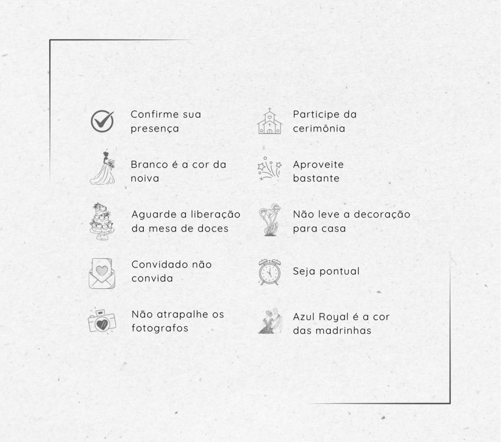 Aqui, vocês encontrarão informações importantes sobre a cerimônia, a festa, lista de presentes e orientações para aproveitar cada momento conosco. Criamos este site para facilitar e, principalmente, para estar ainda mais perto de cada pessoa especial que fará parte desse capítulo das nossas vidas.